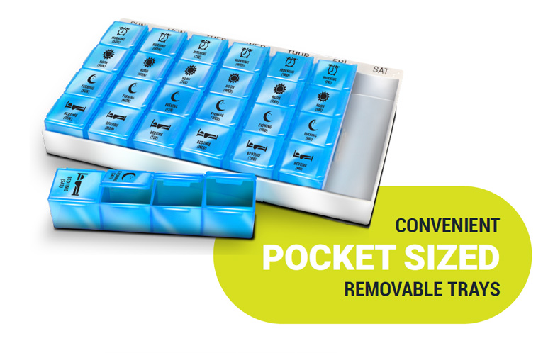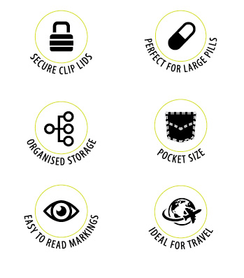 This innovative pill organiser features seven spring loaded, removable trays. Each tray is thoughtfully divided into four labelled compartments for morning, noon, evening, and bedtime doses, all secured with clip-on lids. Enjoy the benefits of organized storage and easy-to-read markings for your convenience. This pill organizer is perfect for larger pills and includes pocket-sized, removable trays, making it an ideal choice for travel with its lightweight and compact design.